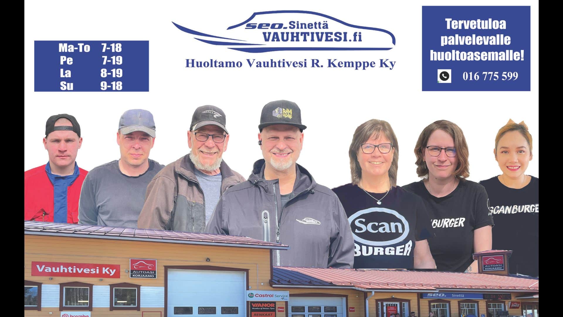 SEO Vauhtivesi on Sinetän kylässä sijaitseva, täyden palvelun huoltoasema. Rovaniemi on vain 20 kilometrin päässä ja sijaintimme onkin erinomainen niin paikallisille kuin Kittilän ja Pellon suuntaan ajaville matkailijoillekin. Emme turhaan kutsu itseämme täyden palvelun huoltamoksi; myymme polttoaineet ja lämmitysöljyt, olemme monipuolisesti palveleva autokorjaamo, teemme erilaiset pienkonekorjaukset, myymme renkaita ja vanteita sekä teemme rengaskorjaukset. Eikä sovi tietystikään unohtaa kahvila-ravintolamme kuumaa kahvia, maukkaita pullia sekä herkullista ruokaa, joita kaikkia tarjoilemme asiakkaillemme viikon jokaisena päivänä. Tervetuloa tankkaamaan niin autosi kuin itsesikin ja kokemaan aitoa lappilaista vieraanvaraisuutta parhaimmillaan.